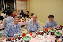 さて、ひとっ風呂浴びれば、いよいよお待ちかねの大宴会である。揃いの浴衣で宴会だなんて、久しぶりだなぁ。いや、前男では初かも。今回は、今春以降相次いで入団された竹内大祐さん(T2)と、小室圭吾さん(T1)の歓迎会を兼ねる。